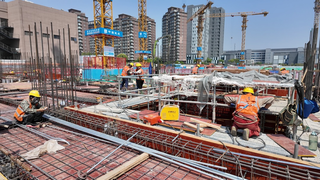 施工现场,工人们专注于各自岗位,机械设备高效运转,处处呈现出热火朝天的建设景象。