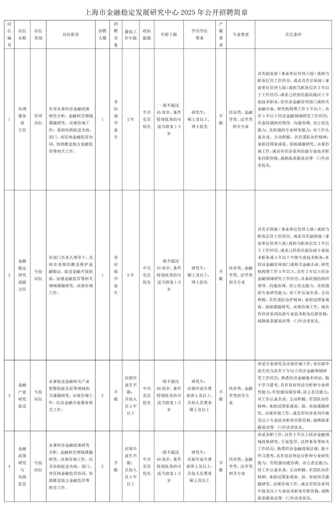 (二)具备招聘单位规定的岗位聘用要求、资格条件、工作能力,详见《上海市金融稳定发展研究中心2025年公开招聘工作人员简章》(附件1)。