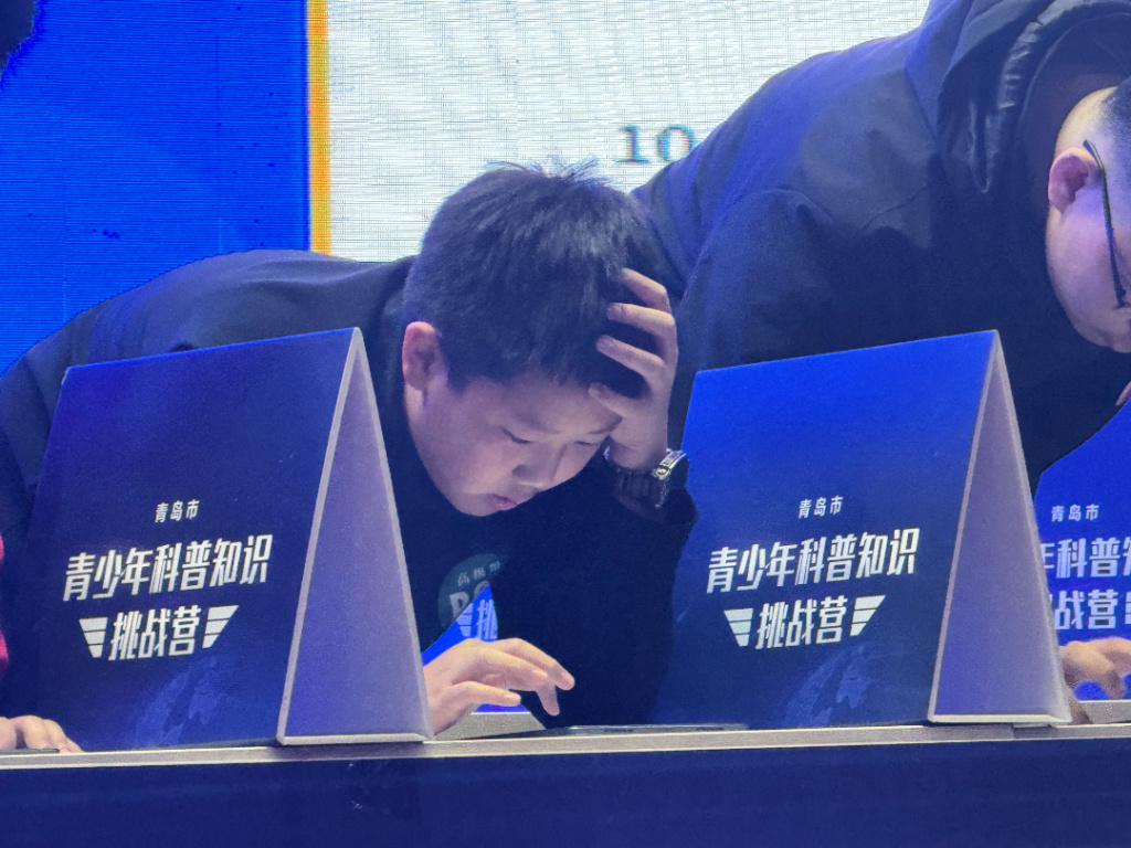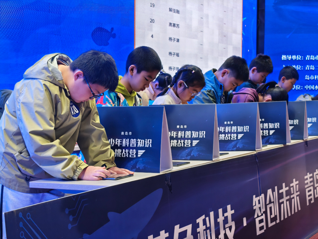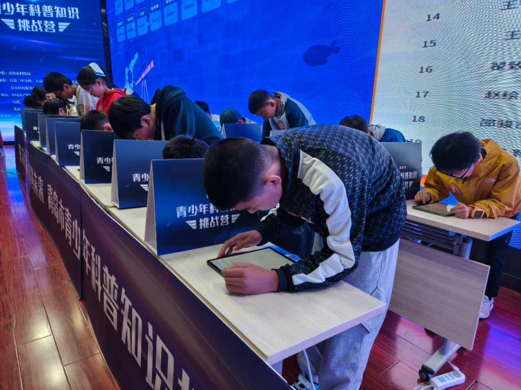 上午八时,正式进入Pad比拼环节,现场气氛瞬间紧张起来。当天分为低、中、高三个组别,按组别登台PK,选手们手指在Pad屏幕上快速滑动,题目涵盖海洋科技、青岛本土科技等丰富领域,答题情况实时在大屏幕呈现。选手们有的抓耳挠腮,额头上沁出细密的汗珠;有的紧咬嘴唇,眼神中透露出紧张与焦虑,但又迅速调整状态,凭借扎实的知识储备迅速破解。有的选手看到题目后,眼中闪过一丝惊喜,迅速在屏幕上选择答案,脸上露出自信的笑容。不少选手为了争夺答题速度,几乎在同一时间提交了答案,竞争异常激烈,当屏幕上出现100分时,现场惊呼声、掌声瞬间响起。“太刺激了,题目很有挑战性,但我很享受这种挑战的过程。”一位参赛选手在答题结束后兴奋地说道,“我感觉自己的知识得到了充分的运用,也发现了自己还有很多需要学习的地方。”