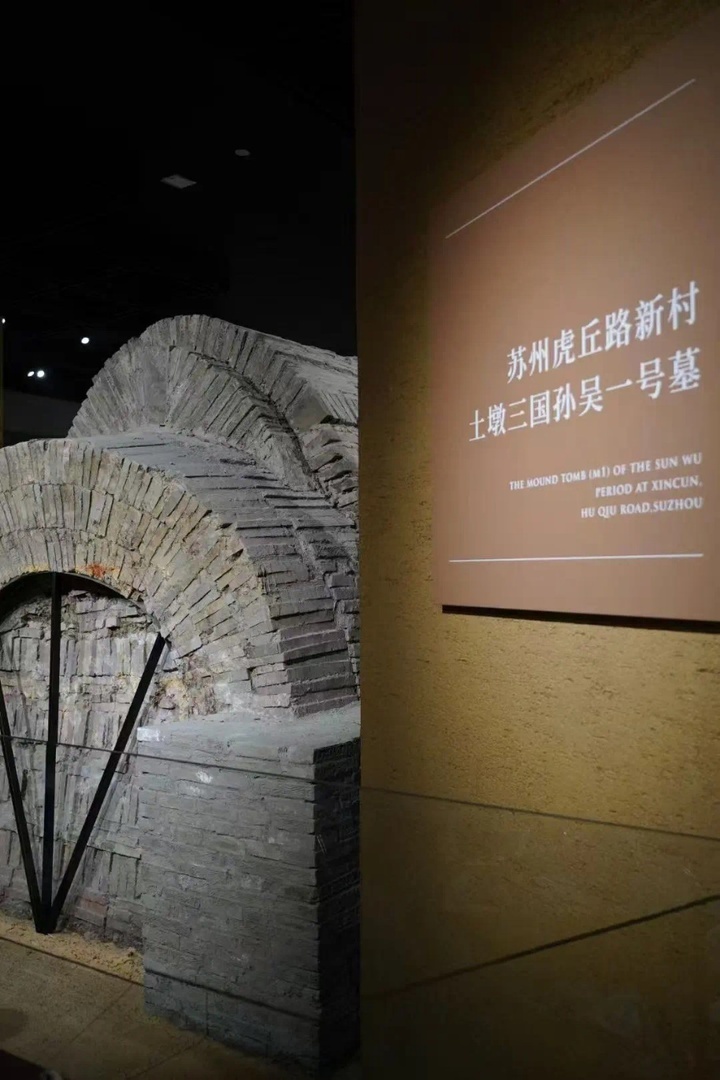 博物馆负一层的“华章江南——苏州考古发现成果”陈列分为“文明溯源”“吴越新证”“都会寻踪”“海丝遗痕”四大篇章,按时间顺序对苏州考古进行叙事。展览以苏州市考古研究所的藏品为展陈底色,甄选陶瓷器、漆木器、青铜器、金银器、玉石器等出土文物1200余件/组,其中,五分之四以上的展品与遗迹属于首次亮相。除此之外,各类搬迁的遗迹本体,精心复原考古现场的真实场景也很值得关注。尤以占地150平方米、重近百吨的三国时期虎丘路新村1号大墓为最,仿佛带领观众穿越时空,亲身体验考古的魅力。