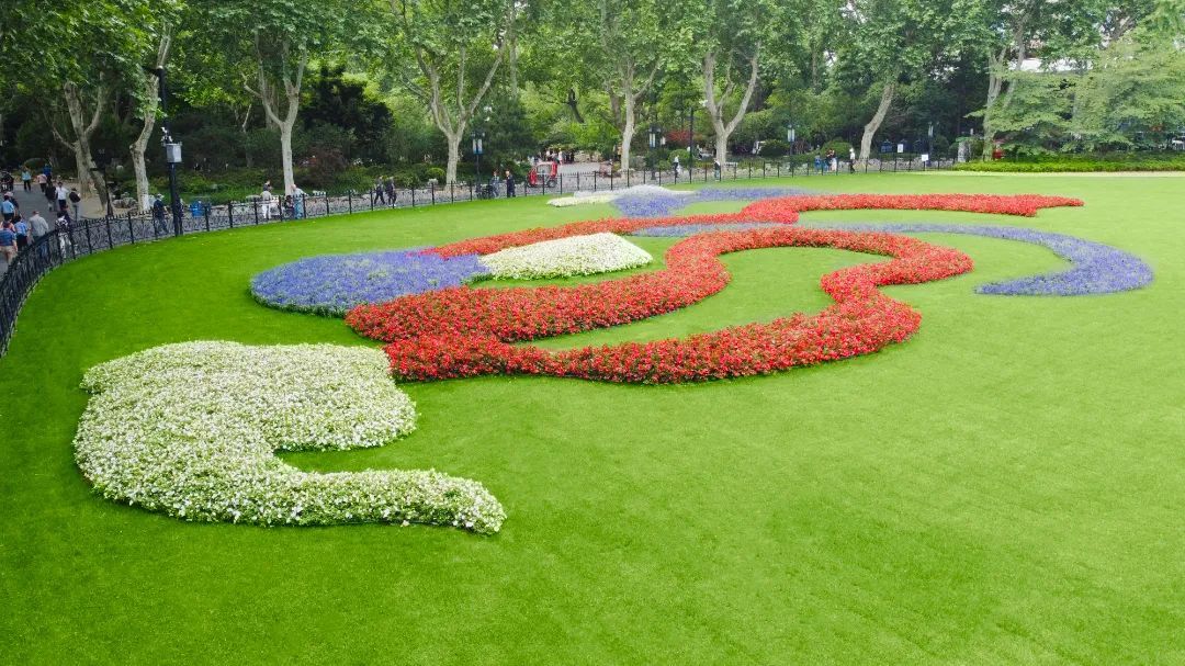 此次花坛所在的大草坪草皮也进行了全面翻新。大草坪四周树木环绕,部分区域光照不足,土壤中长出了苔藓,对草坪生长影响较大。为此,年初鲁迅公园对该区域土壤进行改造,如在土壤层中铺设黄沙改善土壤透气性与排水性。同时,采用混播草籽的方式,春夏选用百慕大草籽,其根系发达、耐践踏,能快速成坪,展现出蓬勃生机;秋冬则播撒黑麦草草籽,让草坪在寒冷季节也能保持翠绿。