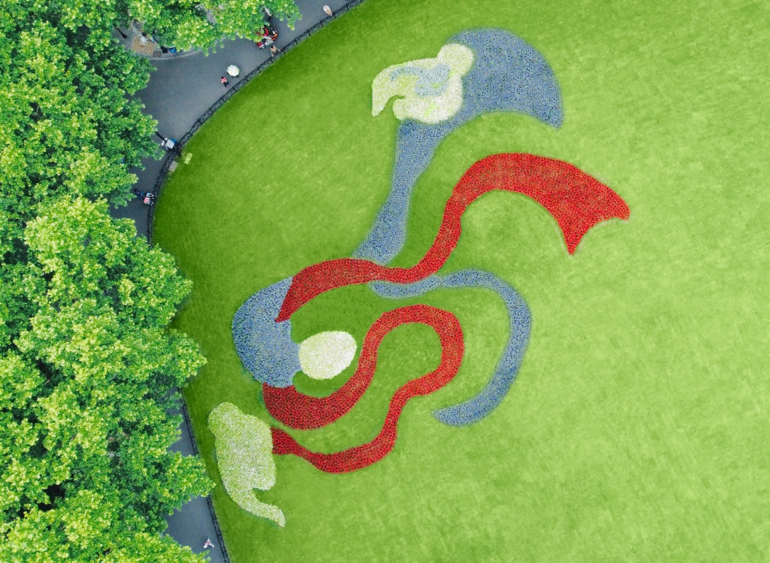 鲁迅公园介绍,新打造的这一花坛名为“朝夕不倦·飞天破茧”。从空中俯瞰,正如其名般呈现出一幅仙子衣裙飘曳、横空飞翔的画面。