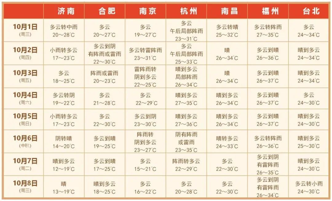 ◆ 节前(9月29-30日)有降水过程,叠加出游高峰,请注意道路交通安全。10月1-4日和5-6日华东中北部有降水过程,部分时段可能出现雨雾,前往当地旅行需注意天气变化。
