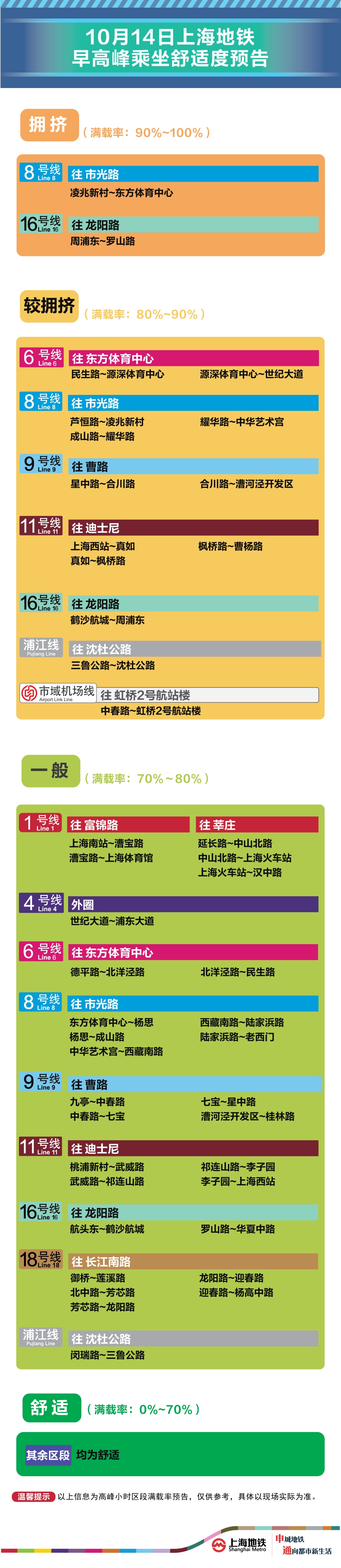 为提升上海地铁早高峰期间出行服务水平,提升乘客乘坐体验,上海地铁向乘客提供乘坐舒适度预告,方便乘客提