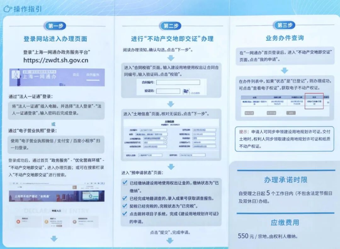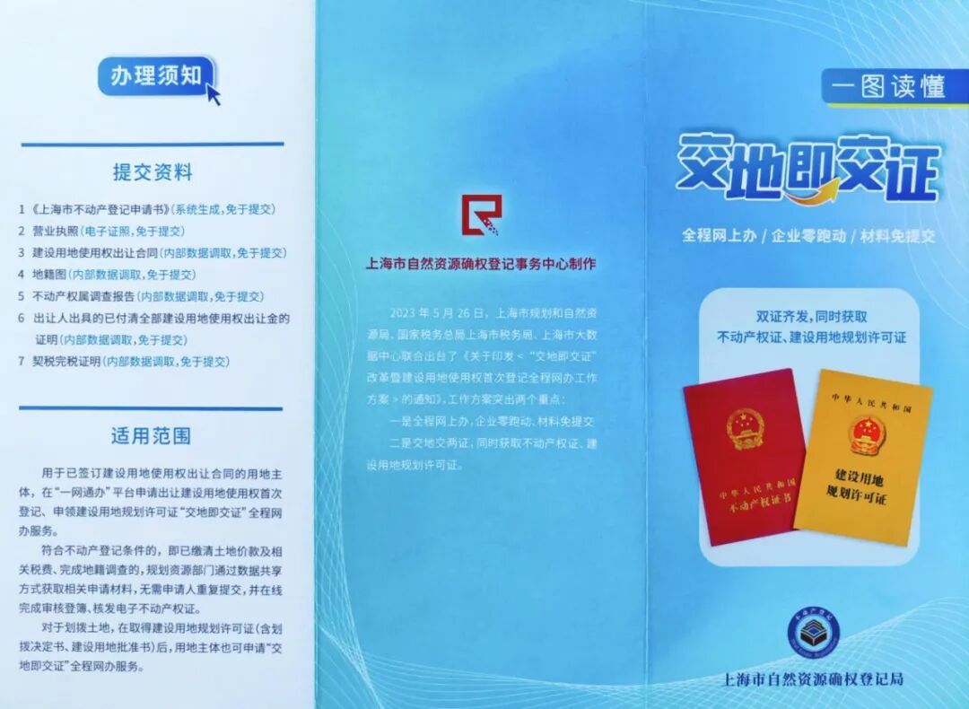 近日,上海锦城祥置业有限公司在完成土地交付、缴清土地出让价款及税费的当天,同步领取了《建设用地规划许可证》和《不动产权证书》(土地),这已是宝山区商品房项目的第6个“交地即交证”案例。目前,宝山区“交地即交证”服务模式已覆盖商办、工业、教育等多种土地供应类型及领域,近一年共完成“交地即交证”案例12个。这标志着宝山区“交地即交证”改革从探索试行阶段迈入常态化服务新阶段,将成为优化营商环境、助推区域经济社会高质量发展的又一重要举措。