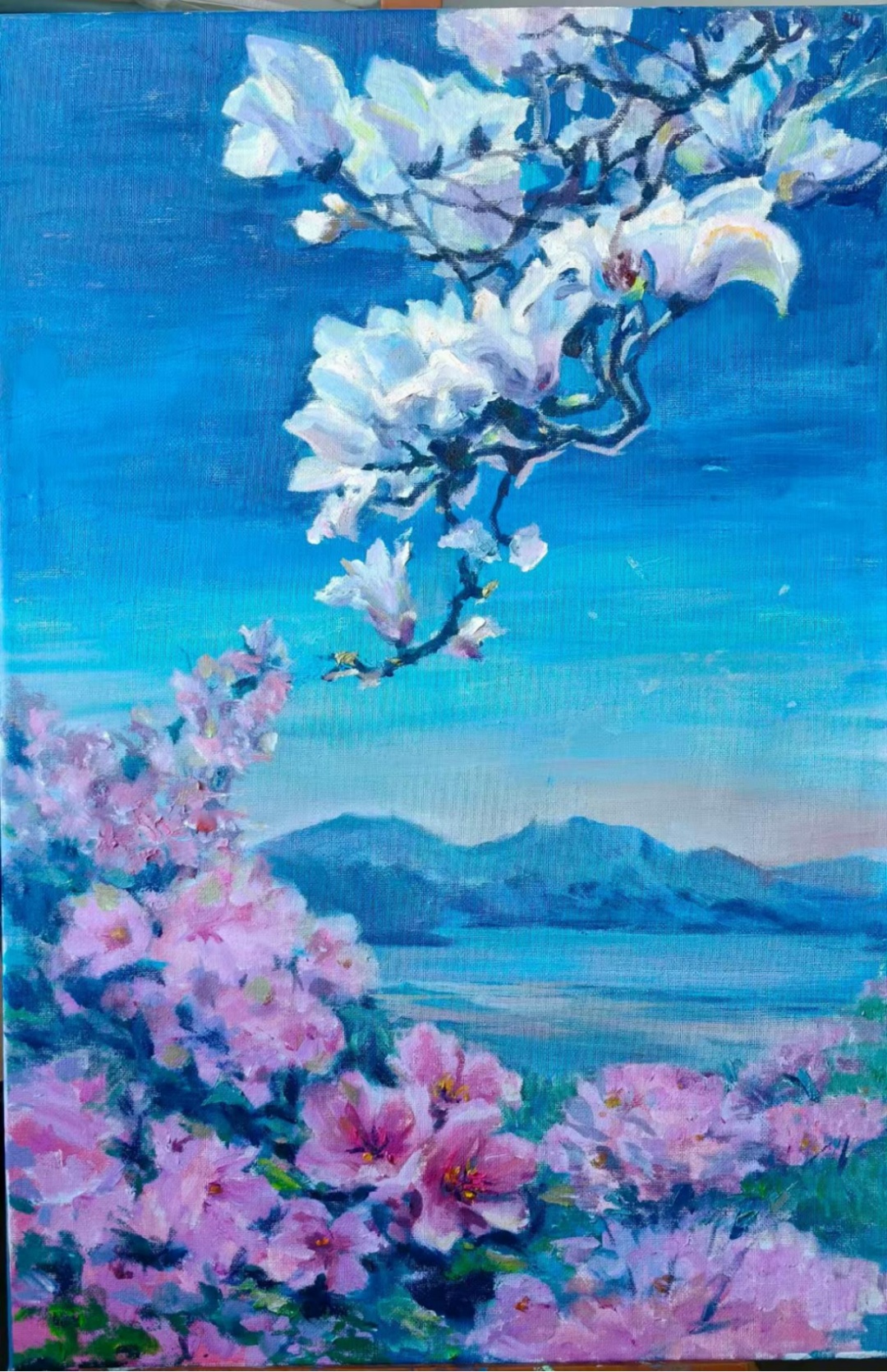 在这幅画里,上海市花白玉兰与台北市花杜鹃相邻盛放。洁白的玉兰如上海的灵动,粉艳的杜鹃似台北的热忱,它们共绽于同一片风景,就像沪台两市,各有风姿却同根同源。中景的阳明山,山峦叠翠,见证着两岸的联结。玉兰与杜鹃在蓝天下依偎,如同沪台两市,虽隔海却情谊相连。这不仅是自然之美的交融,更是两市人心意的呼应。期盼沪台携手,让这份花绽两岸的情谊,在交流合作中愈发芬芳,共绘两岸一家亲的美好长卷,让同根的情谊,如这画中繁花与山水,永远相依相伴。