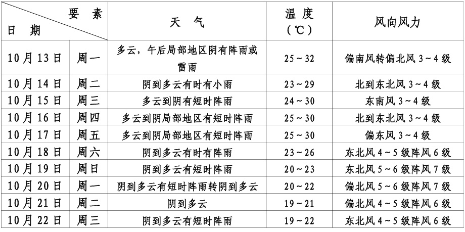 据最新气象资料分析:受副高控制,今天本区多云为主,午后局部有对流天气,最高气温仍可达32℃。14日起,转受高空槽影响,降水过程趋多,气温有所回落。18—20日受冷空气影响,有持续大风,气温将明显下降。