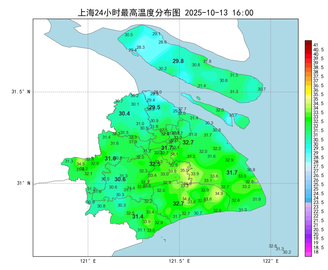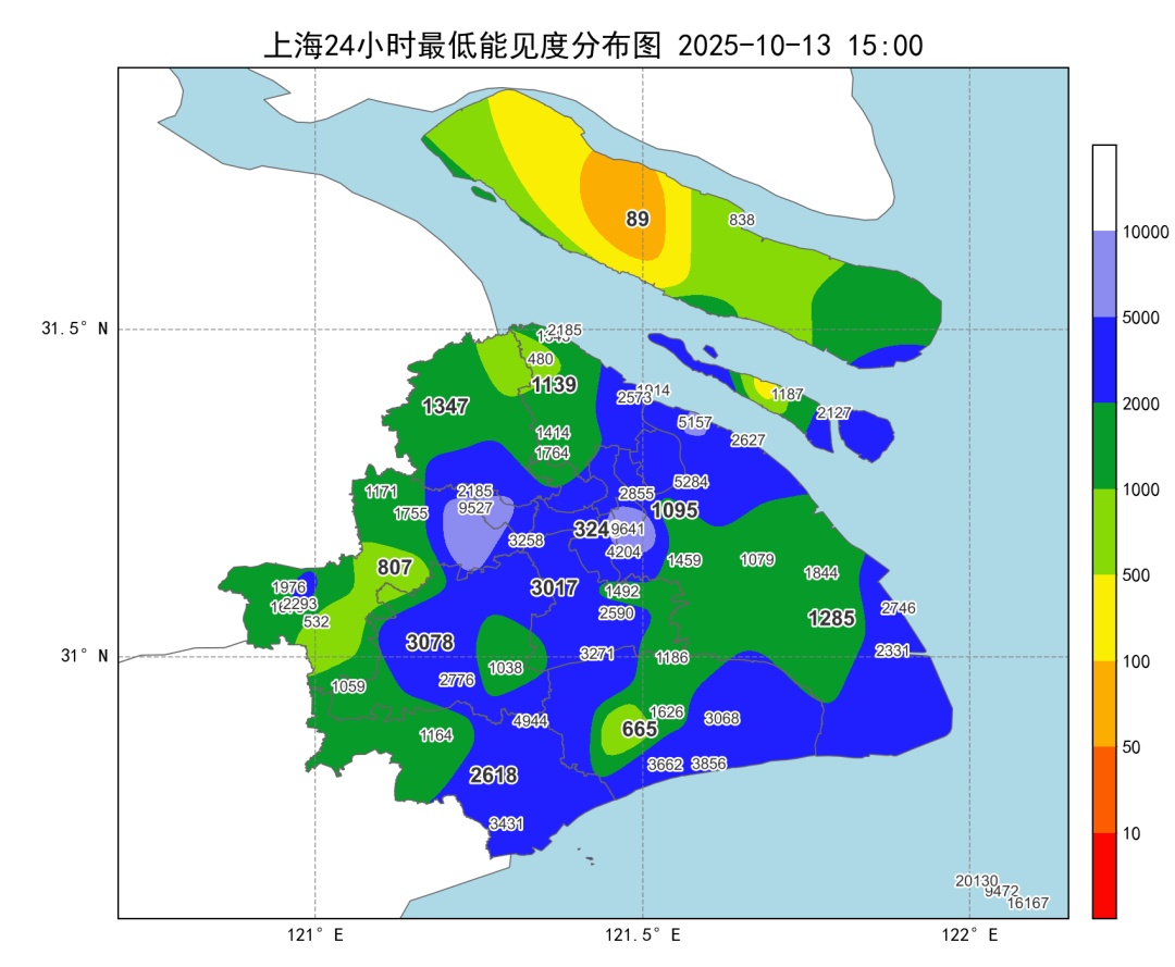 由于风小湿度大,今天凌晨崇明等北部地区出现大雾,个别自动站能见度一度不足100米。今天白天多云为主,全市最高气温普遍在29~33℃之间,市区徐家汇站31.7℃。午后浦东、崇明、奉贤等地出现对流天气。10时到16时的雨量统计显示,最大降水出现在浦东老港镇为52.0毫米。