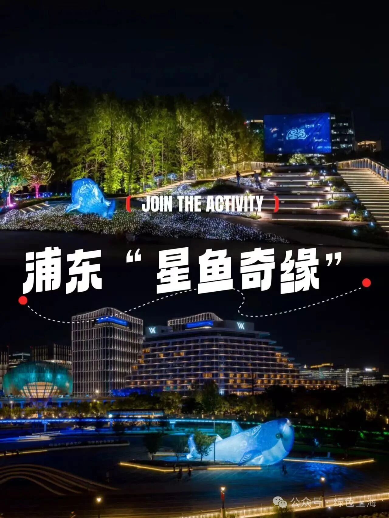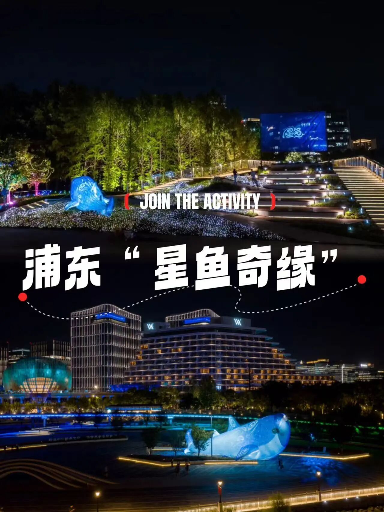 前滩休闲公园的“星鱼奇缘”直接把《星鱼》的绮丽世界搬到草坪上!“星鱼小弓”撕开深海秘境,巨型纱幕动画每天19:00-21:00上演大鱼跃海,还有“星鱼小弩”在江风里“游弋”,和华尔道夫酒店的蓝光绝配,像刚降落的星舰超科幻~