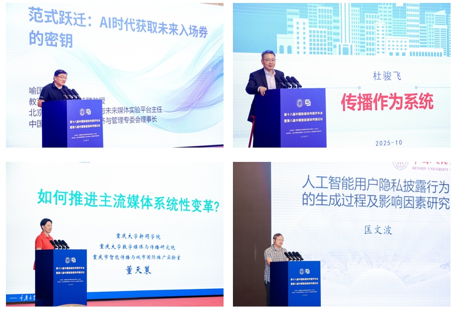 主旨论坛上,来自同行高校、相关领域企业的专家学者围绕如何推进主流媒体系统性变革、智能传播范式与生态变迁、人工智能隐私与信任问题等展开演讲,上海大学新闻传播学院教授吴信训、周宇豪担纲主持。