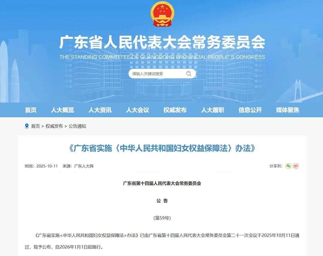 10月11日,广东省第十四届人民代表大会常务委员会第二十一次会议通过《广东省实施<中华人民共和国妇女权益保障法>办法》(以下简称《办法》),自2026年1月1日起施行。