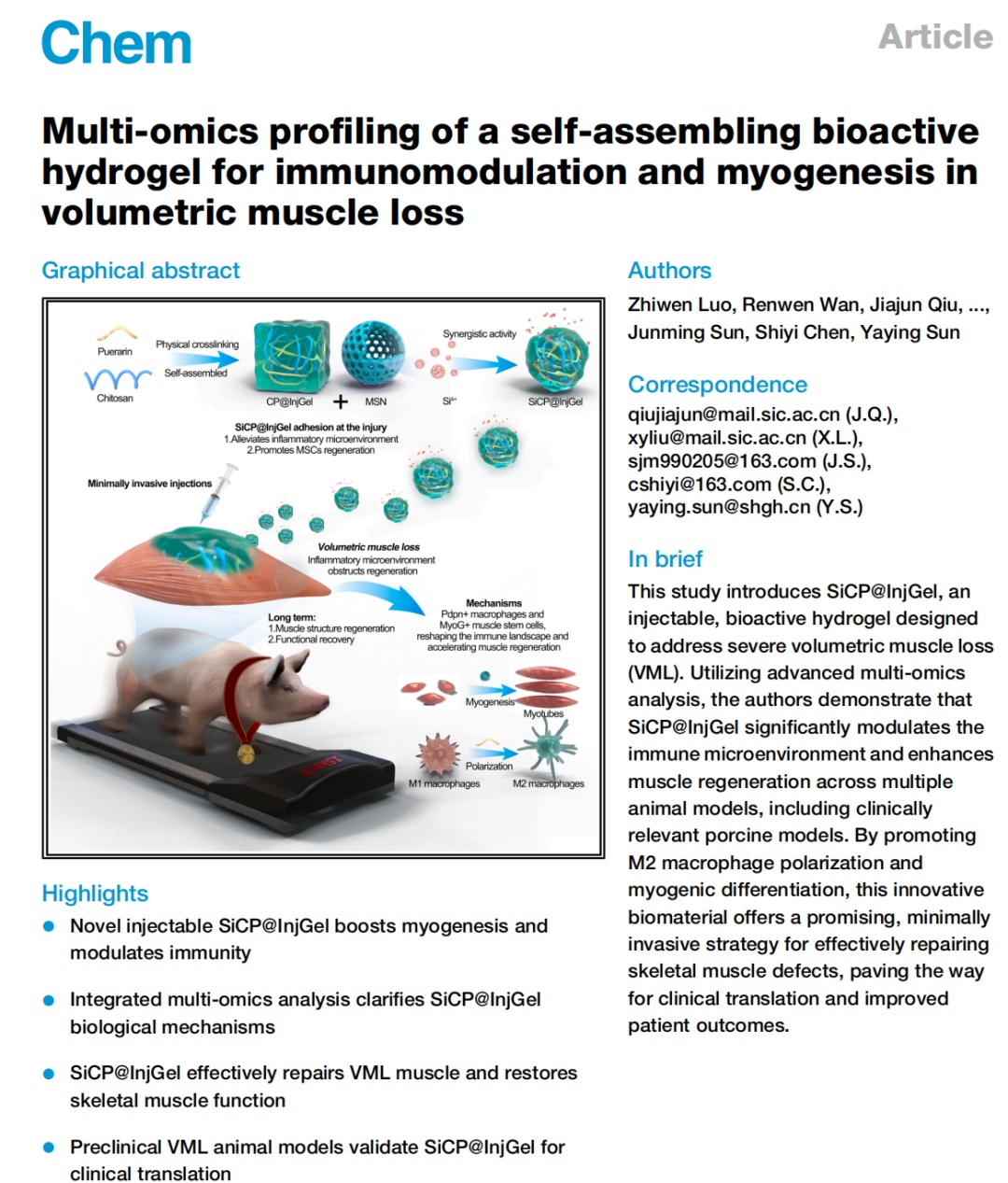 近日,复旦大学附属华山医院运动医学陈世益教授带领其团队骨干成员罗智文研究员、何彦威医生、万人闻博士与中科院硅酸盐所刘宣勇/邱家军教授在国际顶级期刊Chem(Cell大子刊,IF=19.6)发表最新研究成果《自组装生物活性水凝胶在大体积肌肉缺损中调控免疫与肌再生的多组学分析(Multi-omics profiling of a self-assembling bioactive hydrogel for immunomodulation and myogenesis in volumetric muscle loss)》,开发出一种可注射、自组装的多功能生物活性水凝胶SiCP@InjGel助力严重肌肉缺损修复。