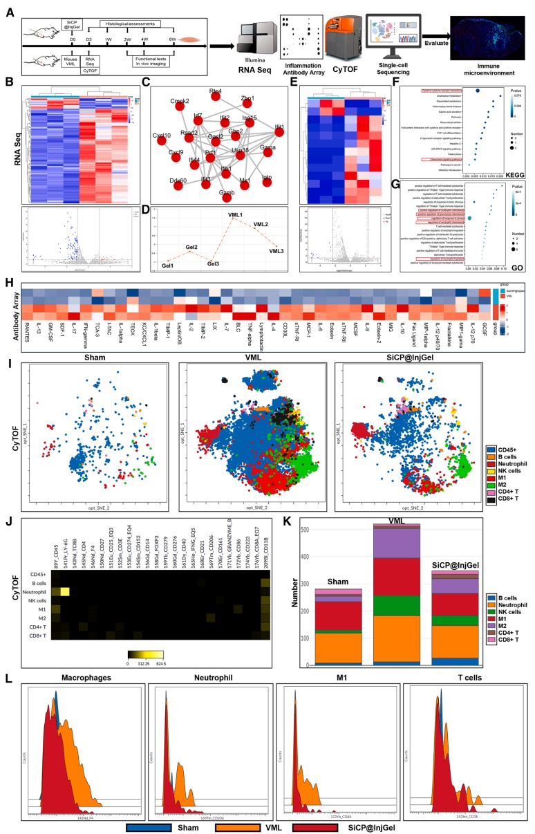 团队结合单细胞转录组(scRNA-seq)、质谱流式(CyTOF)与蛋白组学等多组学手段,系统揭示了水凝胶的作用机制。结果显示,SiCP@InjGel 显著增加 Pdpn⁺M2 型巨噬细胞比例,抑制炎性因子表达,同时激活 MyoG⁺肌源干细胞,促进新肌纤维形成。组织学与功能学评估表明,该材料通过免疫调控与干细胞激活双向协同,构建起“免疫—干细胞—再生”闭环机制,实现损伤肌肉的结构性与功能性双重重建。