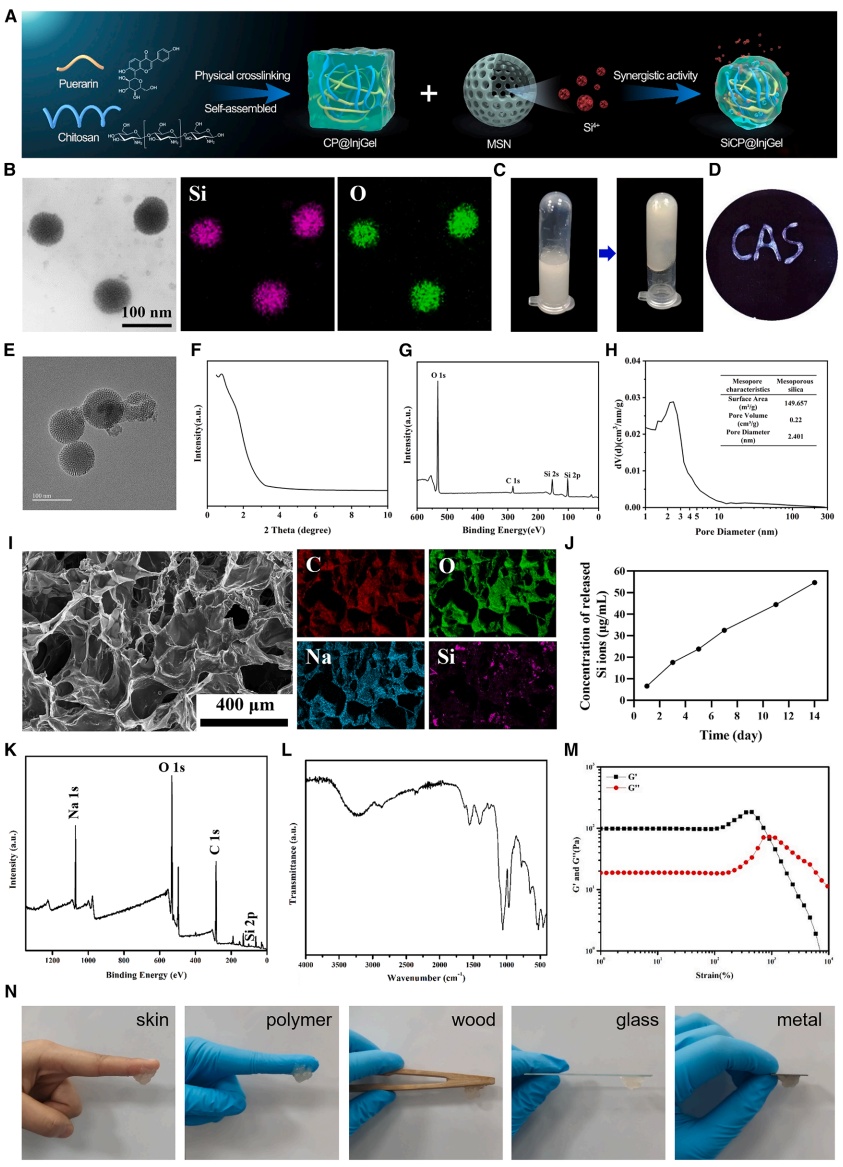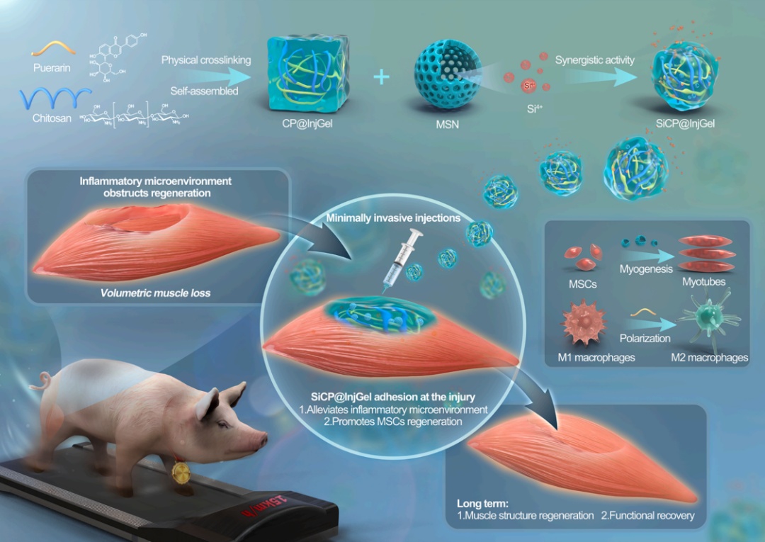 该材料由葛根素、壳聚糖与介孔二氧化硅纳米颗粒组成,具备优异的生物相容性与原位成胶特性。该材料注射后能快速凝胶、紧密贴合创面并逐步降解,实现“智能”匹配修复进程。葛根素可抑制炎症并诱导M2型巨噬细胞极化,介孔二氧化硅释放的硅离子促进肌源细胞增殖分化,而壳聚糖提供三维支架支持组织再建,三者协同作用显著促进VML修复。