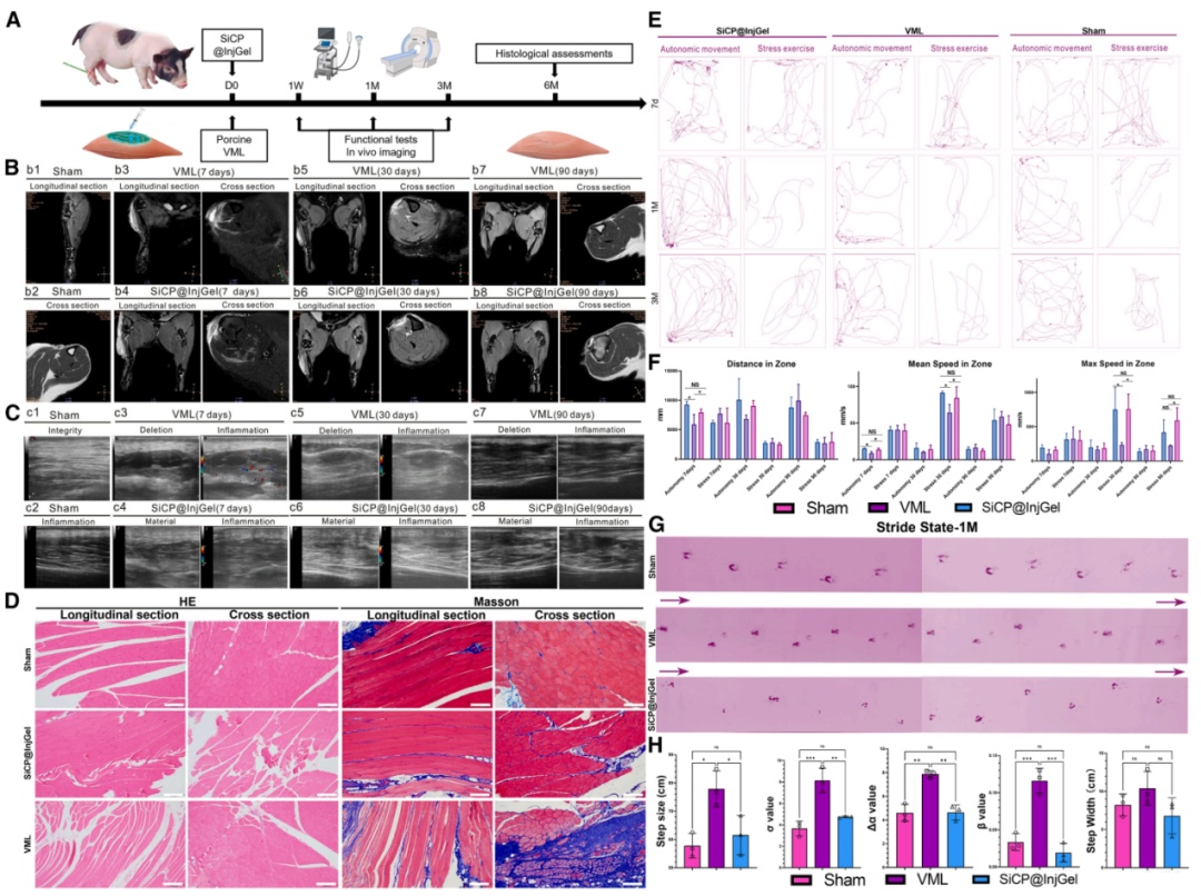 在小鼠、大鼠及猪等多种动物模型中,SiCP@InjGel均展现出显著的组织再生与功能恢复效果。影像学、超声、组织学及行为学评估一致显示:该材料可在术后数月内被完全吸收,促进新生肌肉的功能化重建。尤其在猪模型中,步态与抓力恢复接近正常水平。该研究联合中科院上海硅酸盐研究所、上海交通大学等多学科团队协作完成,体现了“源于临床、服务临床”的科研导向,为严重肌肉缺损的微创修复提供了创新性“可注射、可降解、可调控”的再生医学新方案。