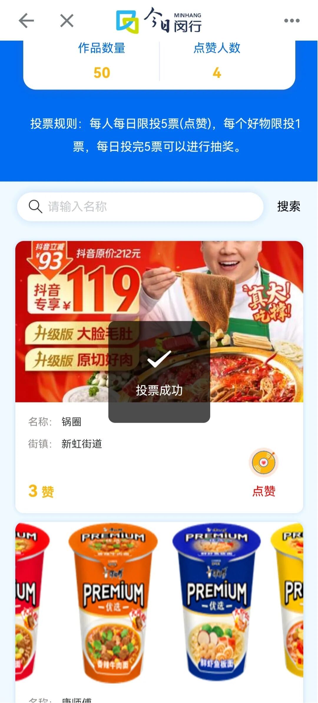 2.找到“春申美好生活季”——闵行好物(优品),即可为心仪好物投票。每个IP每日限投5票,且单个产品每日限投1票(合理分配票数,给每款心仪好物都送上支持!)。投票结束后,区商务委将联合区文化旅游局、区市场监管局、区消保委等多个权威部门,再加上专业专家组成评审组,综合网络投票结果与产品品质、市场口碑、产业价值等多维指标进行评定。最终,排名前10的产品将直接荣获“闵行好物(优品)”称号;排名第11—20名的产品也将获得“闵行好物(优品)提名”的荣誉。投满5票