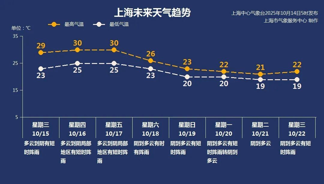 周三至周五,受副热带高压边缘影响,上海多云到阴为主,有短时阵雨,气温在24~30℃之间。周六前后,随着副热带高压减退,冷空气南下,本市将有一次降雨、降温和大风天气过程。之后气温持续下跌,下周初的气温全面降至23℃以下,秋天的脚步临近了。