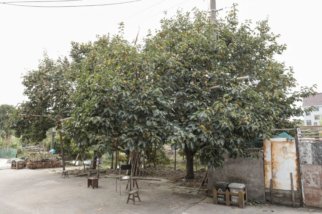 10月13日上午,记者走进金汇镇周家村,村民王国清家院内的两棵柿子树格外引人注目。据王老伯介绍,这两棵树是他于1986年亲手栽下,历经近四十载光阴,昔日的树苗已长成枝繁叶茂的参天大树,挺拔的身姿需人仰望,如伞的树冠下甚至能摆桌乘凉,成为村里一道独特的风景线。