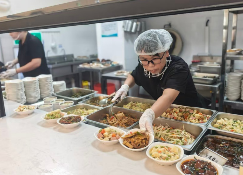 上午10:30,食堂开始热闹了起来,陆续有居民前来用餐。窗口内,清炒藕片、鱼香茄子、红烧排骨、百叶结包子、狮子头……菜品琳琅满目、色泽诱人、香气扑鼻。据介绍,食堂每日都会推出数十种菜品,单价从三元到三十元不等。常来就餐的唐老伯笑着说:“价格实惠,二十元左右就吃得挺好,离家近、味道好,像红烧肉、狮子头等菜,我经常点。”