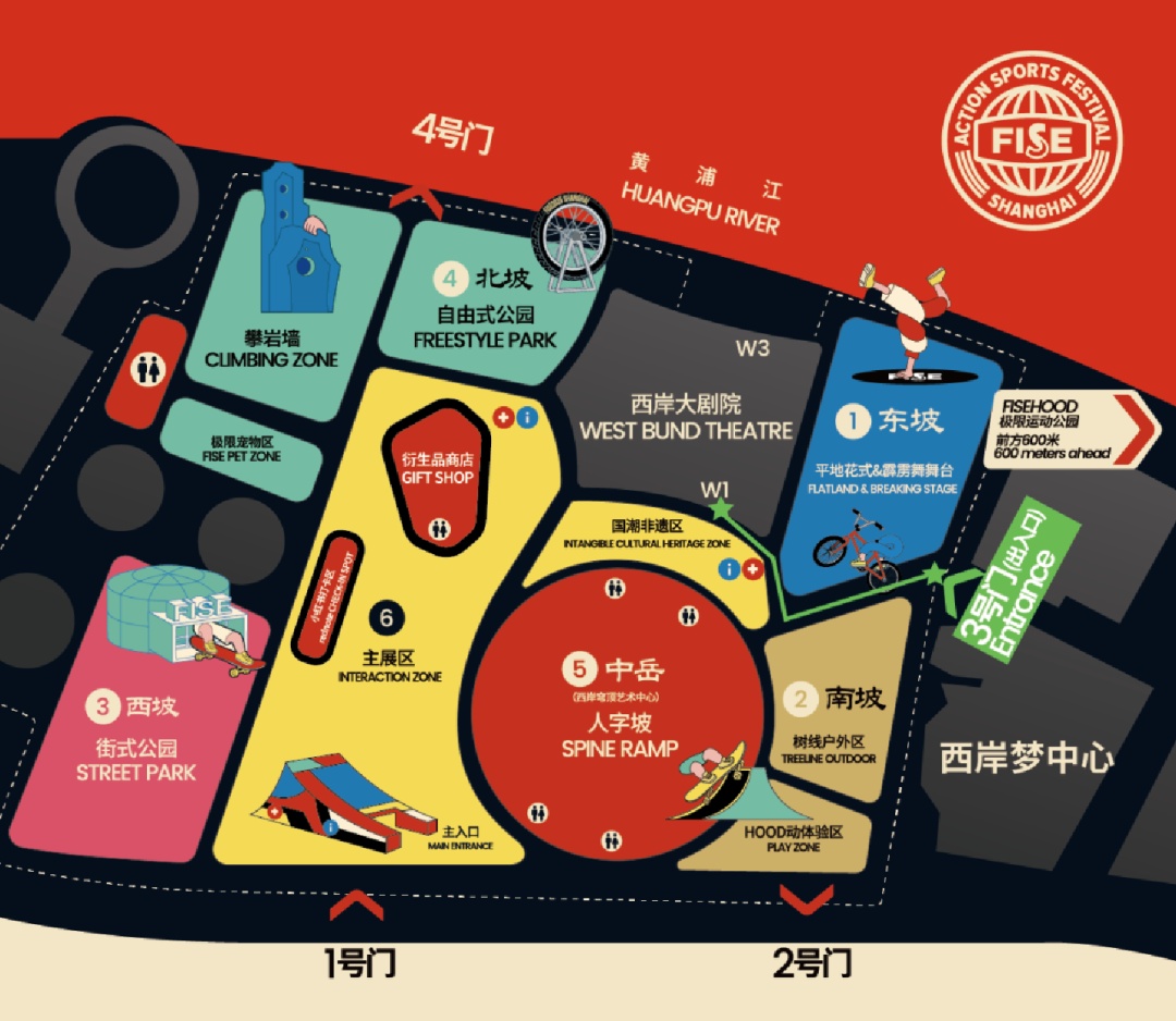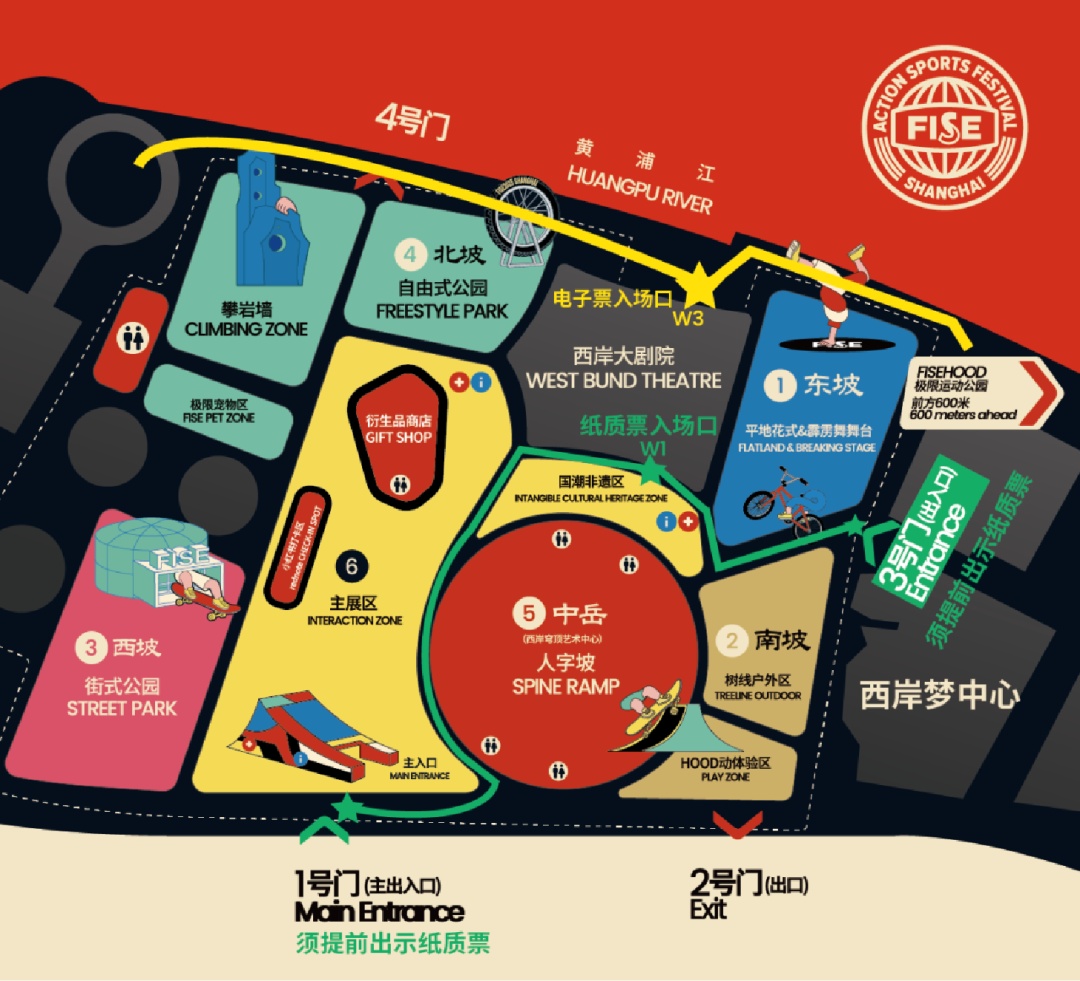 请提前取好纸质票的观众可凭借纸质票从1号门和3号门进入FISE活动区域,到上海西岸大剧院W1门处安检入场,持电子票入场码的观众请从滨江步道至上海西岸大剧院W3门处安检入场。