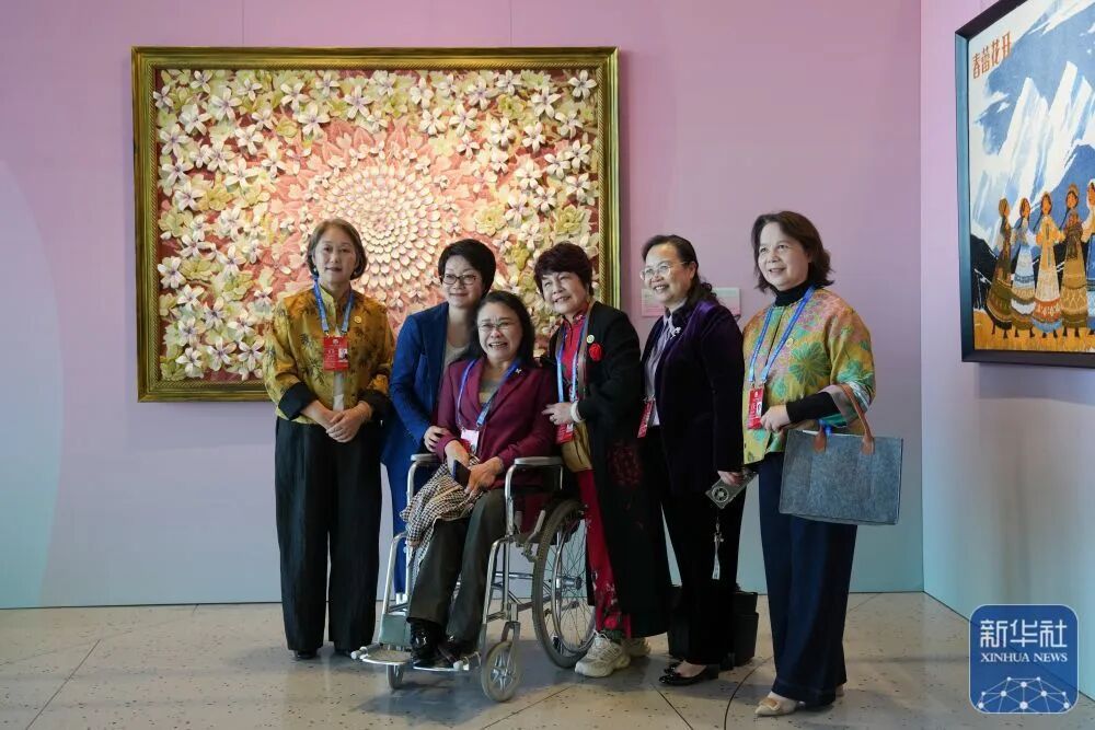 参会的张海迪等嘉宾在全球妇女峰会女性主题特展“华韵承芳·非遗共赏”上合影。新华社记者 胥冰洁 摄