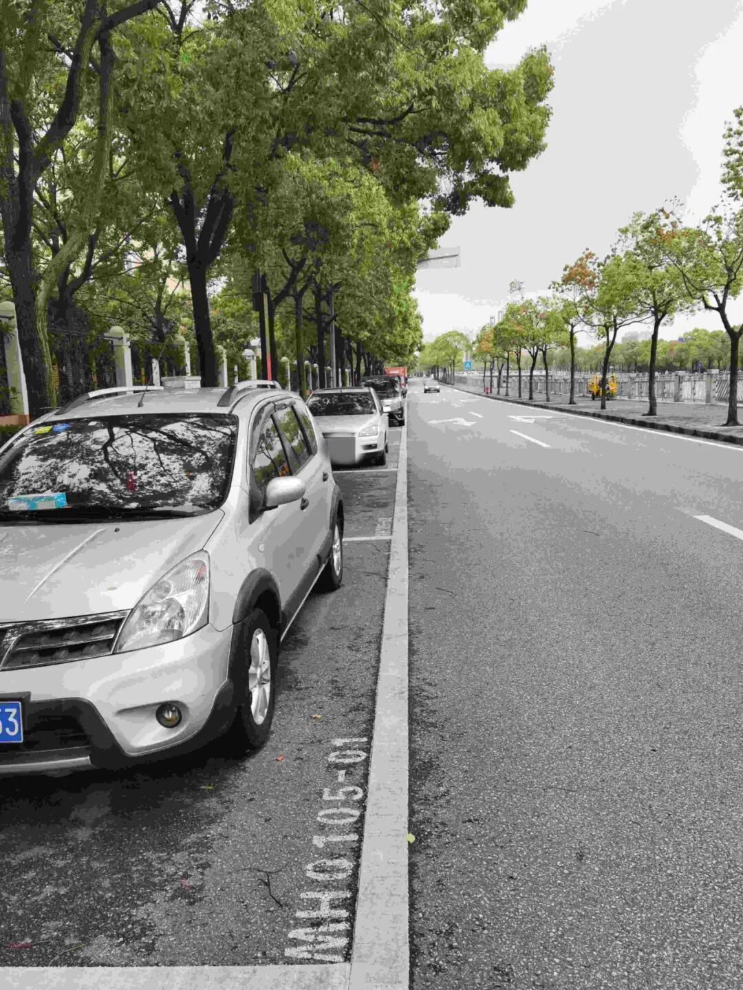 每个停车位均施划白色边框,实线封闭边框表示可全天停放,如下图↓