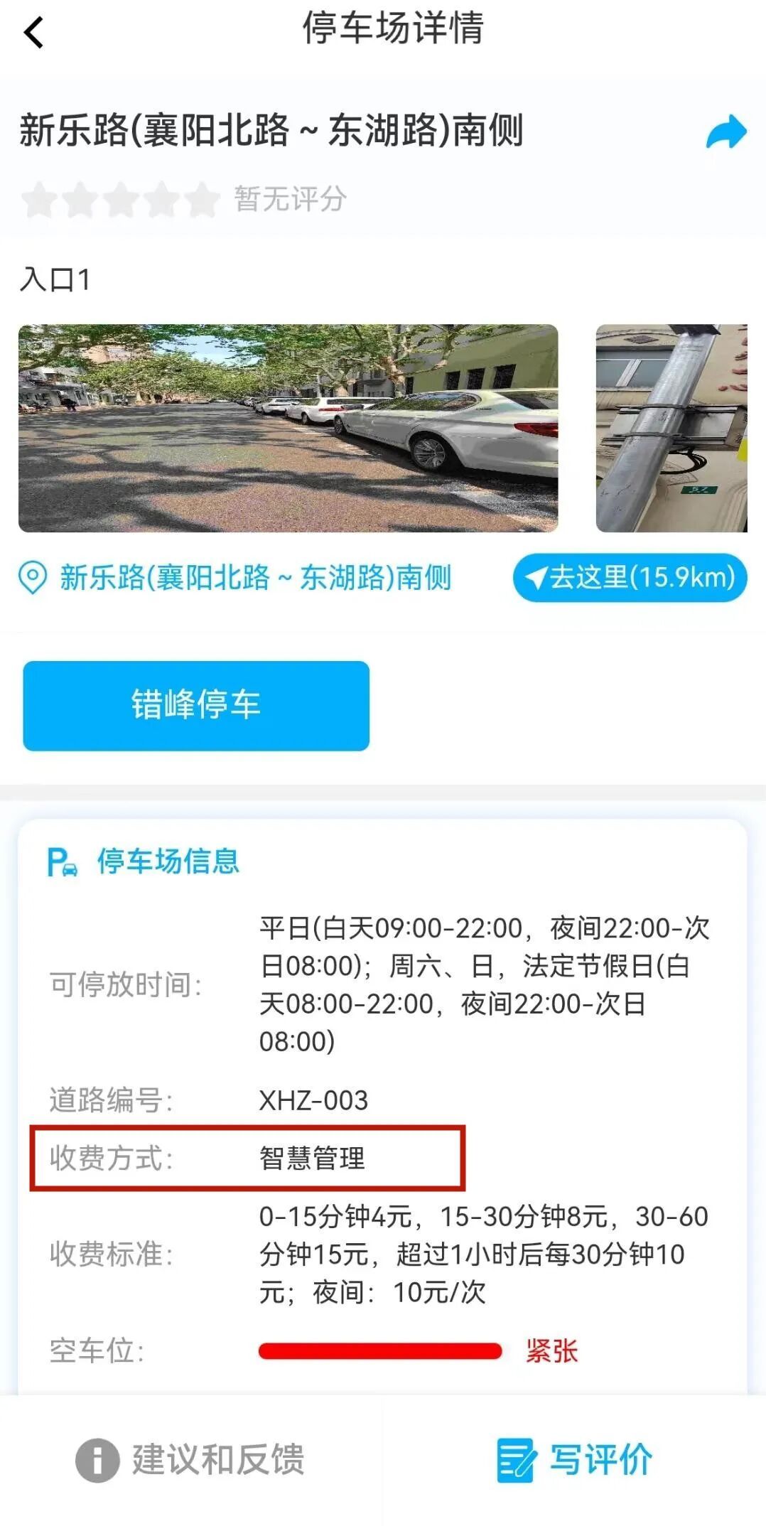 点击“找车位”页面,在顶端搜索栏输入道路停车场名称后点击进入详情页,在下方文字信息中查看“收费方式”,标注“智慧管理”的属于智慧道路。