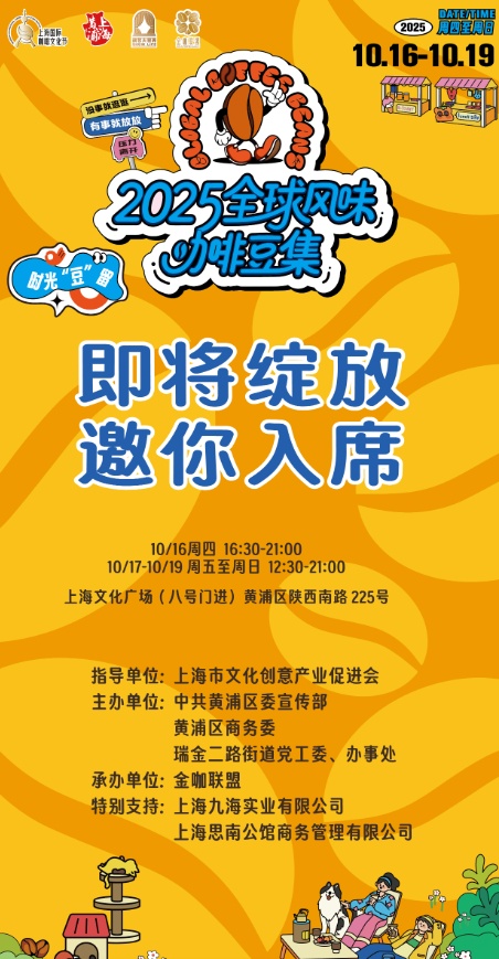 10月16日至19日,由上海市文化创意产业促进会指导,中共黄浦区委宣传部、黄浦区商务委、瑞金二路街道党工委、办事处共同主办,金咖联盟承办,上海九海实业有限公司以及上海思南公馆商务管理有限公司特别支持的2025全球风味咖啡豆集将在上海文化广场举办。