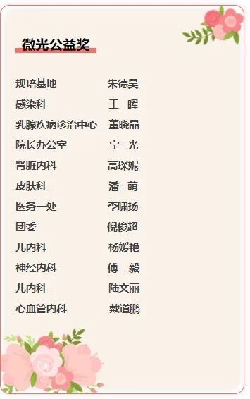 在副院长蔡伟正式开启两个“善爱专项”——“随手捐”公益专项:“罕见肉瘤患儿复诊援助”项目和“拯救小黄人”项目后,瑞金医院党委书记胡伟国宣读瑞金医院公益积分获奖名单。他说,为深入践行“广博慈爱,追求卓越”的瑞金精神,激发全院职工参与公益服务的内生动力,瑞金医院打造起全方位公益服务体系,形成了“向善、向上、向发展”的瑞金善爱文化氛围。项目运行至今,涌现出诸多公益先锋,今天,医院对公益积分排名前十位的瑞金人进行表彰,颁发瑞金医院首批“微光公益奖”,他们是:
