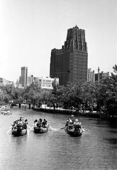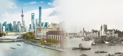 从历史深远处一路走来,从新中国新上海一路走来,今天,新时代的上海正着眼城市文明新形态,推进现代化人民城市建设。右图为今天的一江一河和新中国成立之初的一江一河。