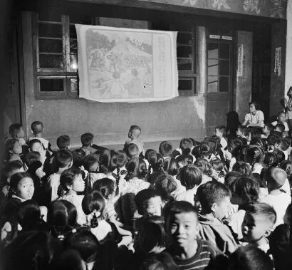 1961年8月2日,孩子们聚集在一起乘凉看幻灯片。