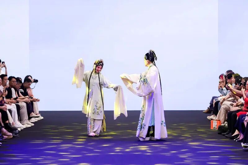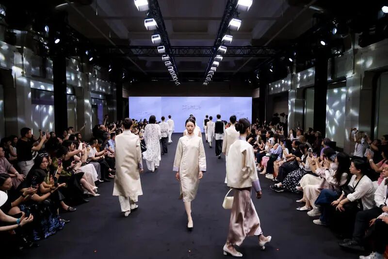 这场由上海纺织时尚产业发展有限公司与上海市历史博物馆联合主办的活动,打破了传统时装秀的边界。开幕首秀上,苏小乔品牌以宋锦为纸,将昆曲工尺谱化作暗纹,唱词绣入衣襟,“衣曲山河” 系列让非遗技艺在丝织物上流转着吴侬软语的浪漫;中元素恰逢十周年庆典,以 “承东方・向未来” 定义中式男装新范式,著名演员、导演、监制吴樾身着定制服饰演绎太极意韵走秀,将东方男性的刚柔并济藏于步履间,预示着男装市场的文化觉醒。后续登场的衣架、庄容、熊英・盖娅传说则勾勒出女性新中式穿搭的多元图景:水晶钉珠晕染宋雅风骨,苏绣与手绘织就时光叙事,十二花神灵感化作珠绣花瓣,更有高定成衣实现艺术与日常的无缝衔接,连新疆艾德莱斯非遗工艺也在此焕发新生。
