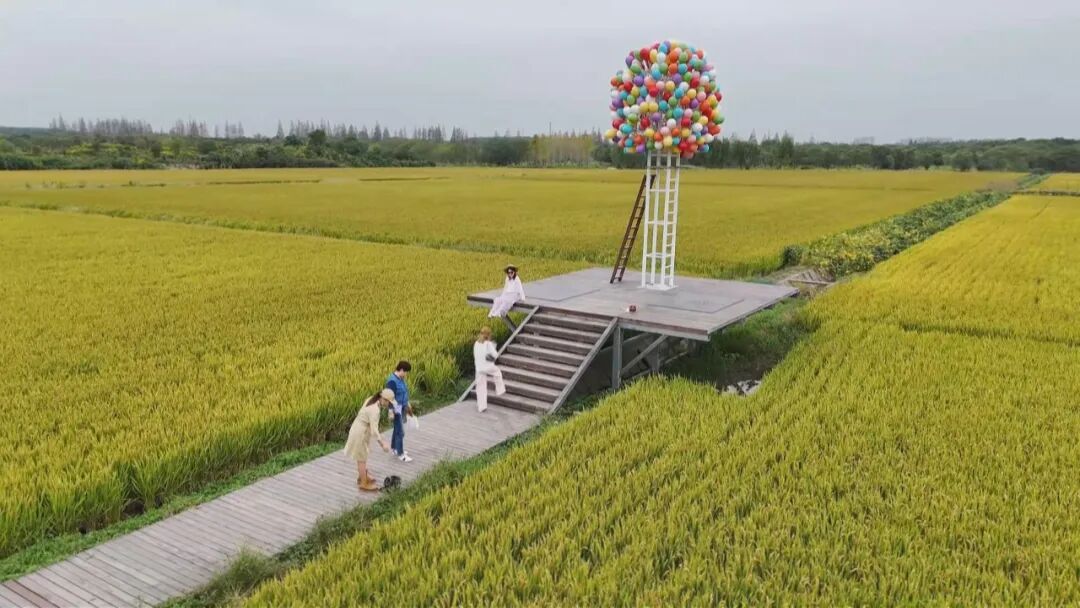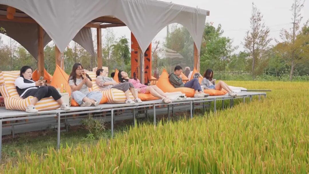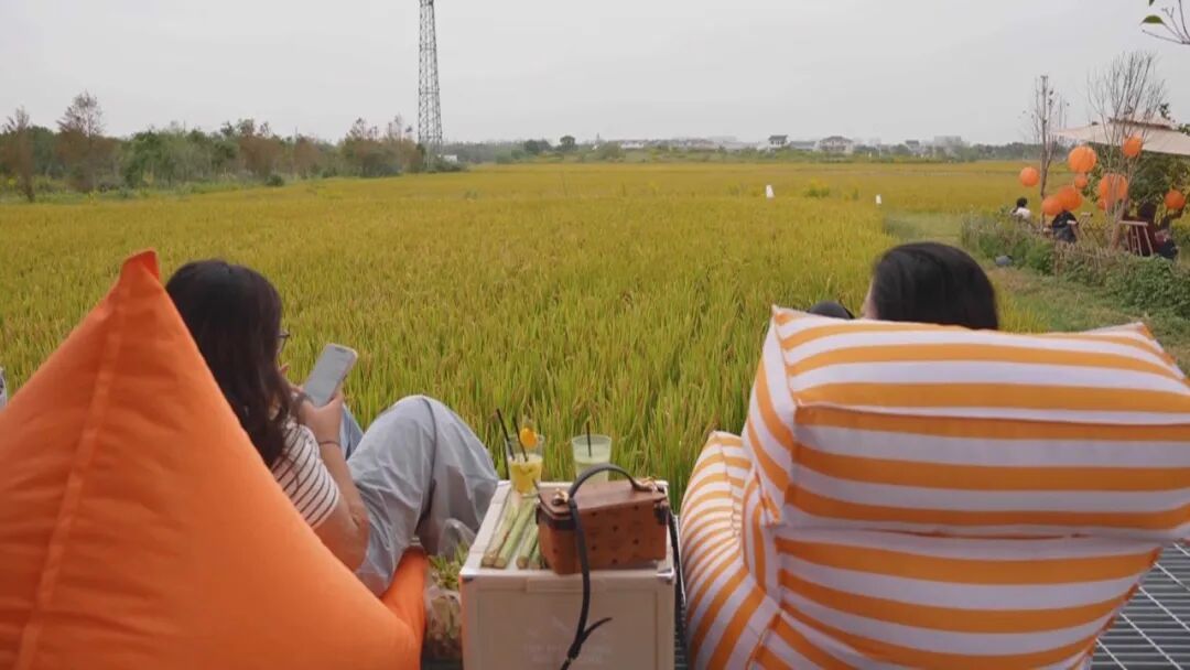 近日,记者走进“无忧闲院咖啡馆”,连片近熟的稻田率先映入眼帘:饱满的稻穗沉甸甸垂坠,在阳光下泛着温润的金黄,微风拂过,稻浪层层翻滚,宛若一片流动的金色海洋。咖啡馆在稻田中央搭建了观景平台,柔软的懒人沙发错落摆放,不少客人手捧香醇咖啡,或静静欣赏田园景致,或与同伴轻声闲谈,享受着都市中难寻的松弛感。