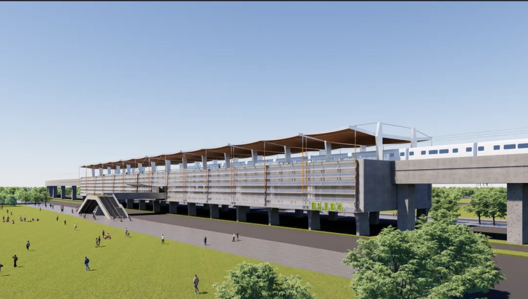 徐乐北路站位于青浦区华新镇,北青公路与徐乐北路交叉路口西侧,沿北青公路东西向设置于路中,为高架三层侧式车站,全长220米。车站与北青公路改扩建工程同步实施,建成后将形成“双向8快(含2条辅道)2慢”,双侧人行道宽度均为4米。该站点紧邻凤溪“城中村”开发片区,未来将依托TOD模式打造区域交通枢纽,推动“站城一体”高效开发,服务周边产城融合发展。