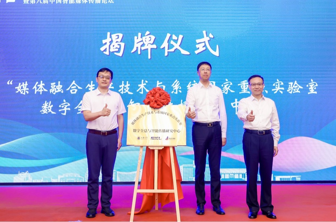 上海大学新闻传播学院自2018年就确定了“智能传播”这一战略发展方向,致力于以高水平科研平台建设拉动科研、教学和团队建设。开幕式上,学院与新华社国家重点实验室、东方网共同建立“媒体融合生产技术与系统国家重点实验室数字全息与智能传播研究中心”,在上海大学党委书记吴坚勇见证下,新华社国家重点实验室副主任钟昊熹,上海报业集团党委副书记、总经理、副社长胡明华共同为研究中心揭牌。钟昊熹副主任在致辞中表示,人工智能技术正在工具层面和系统层面重塑传媒的业态与生态,此次与上海大学和东方网共同搭建实验性研究平台,旨在坚持“四个面向”,从数字全息与智能传播的交叉视角切入,搭建产、学、研、用贯通融合的科研联合体。作为国家级的科技创新平台,国重实验室将全力支持研究中心的发展,充分发挥三方优势,在学术创新、技术创新、产品创新和人才培养等各方面持续产出优秀成果和实际效益。
