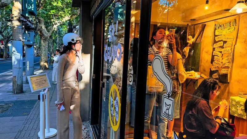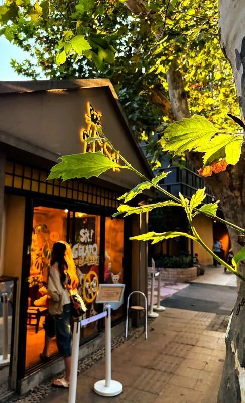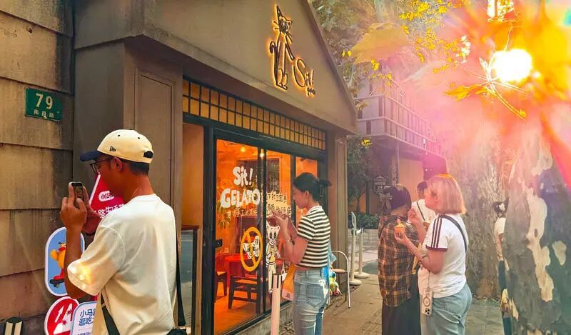 目光总会被斜对面的 Sit! gelato 牵走——它奶油色的外墙洞里,悄悄摆设着几只可爱又懒散的“宠物猫”,仿佛在用一种无声的语言邀请你加入这场午后发呆。举着双球甜筒的姑娘,正俯身与它们对望。开心果味浓郁得恰到好处,抿一口,仿佛听懂了那份慵懒的叮嘱,整个夏天的预告都在舌尖化开。
