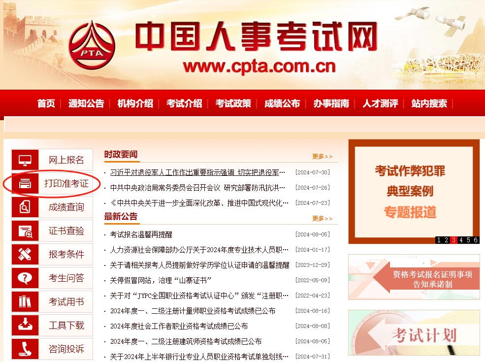 中国人事考试网(www.cpta.com.cn)——“打印准考证”栏目。
