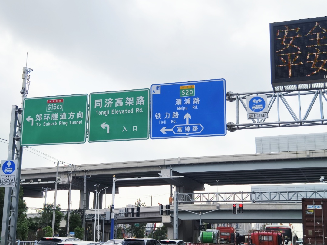 为做好广大司机出行注意提醒,交通部门已提前在本市快速路、高速公路沿线及收费站电子显示屏滚动播放限行提示语。现场G1503上海绕城高速下富锦路江杨北路路口前,国四柴油载货机动车禁行的指引标识和禁令标志也已设置完毕。
