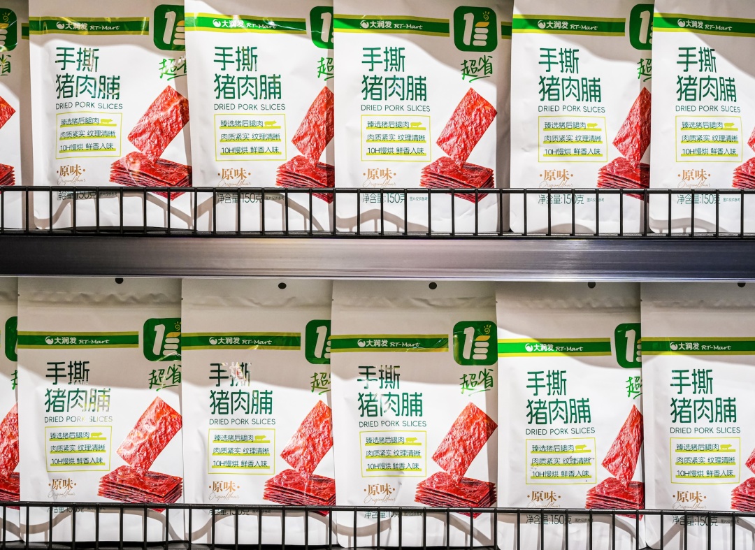 记者在位于静安区的大润发(闸北店)看到,本次品牌节一次性集结近500款自有商品,用“超省”系列把价格打到底。11.8元/袋的手撕猪肉脯、4.9元/包的一次性保鲜膜罩、9.9元的洗护三件套等爆款直接对标电商底价。