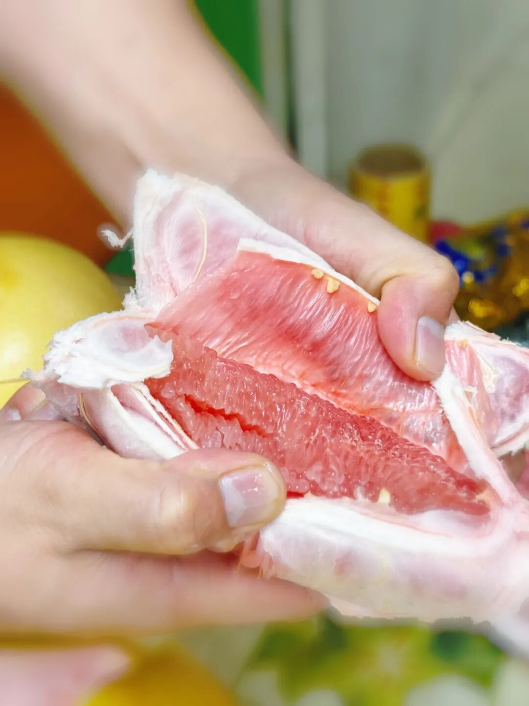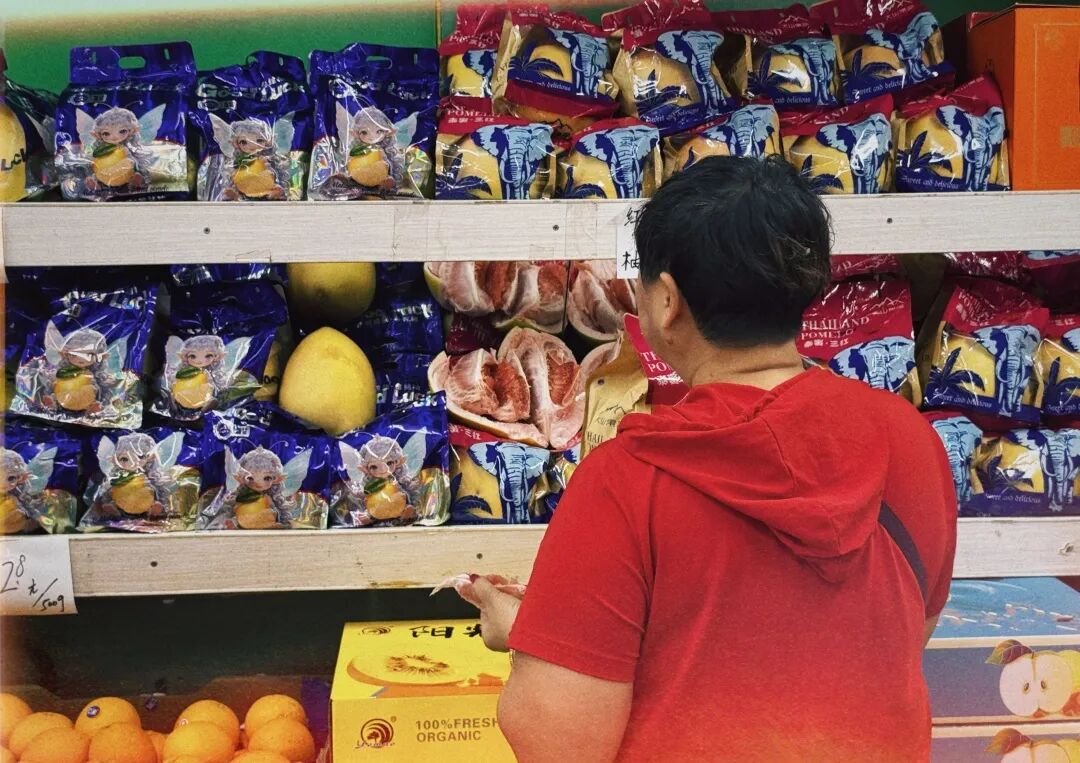 上午九点半,阳普国和菜场里,两家水果摊前黄绿相间的柚子堆成小山,品类繁多,成了最抢眼的风景。