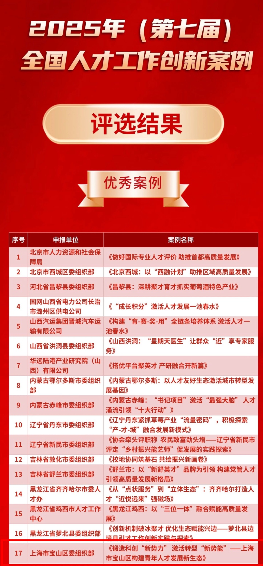在最新公布的2025年(第七届)全国人才工作创新案例评选结果中,由上海宝山区委组织部、区人才工作局报送的《锻造科创“新势力”激活转型“新势能”——上海市宝山区构建青年人才发展新生态》案例,从全国1200余篇案例中脱颖而出,荣获“优秀案例”奖。