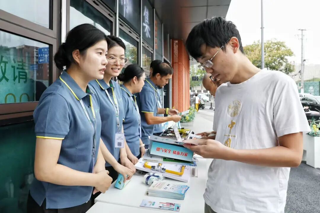 居民们在漕河泾街道石龙党群服务中心门口的展台前,学习了解燃气安全相关知识