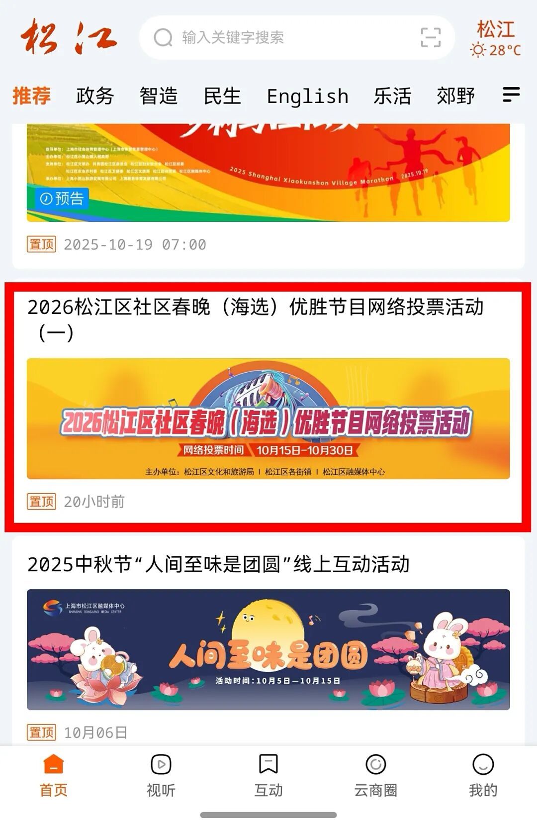 1.前往“上海松江”微信公众号或“上海松江”App首页,找到活动投票入口。