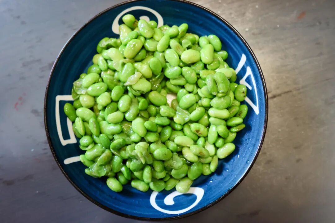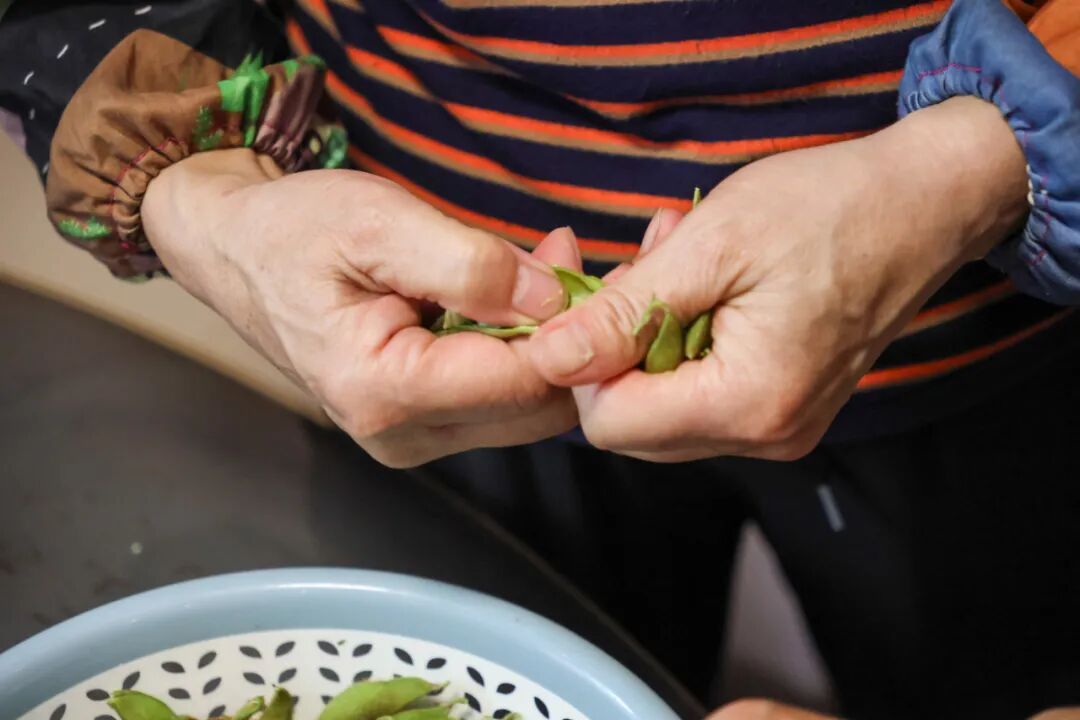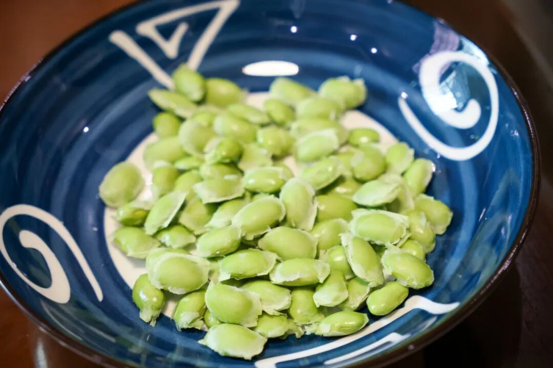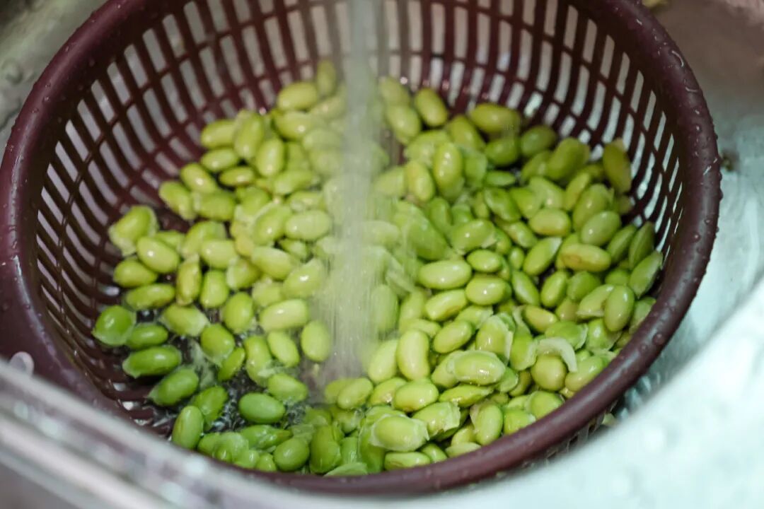 从田间收获毛豆荚后,剥去外壳,即可见其翠绿色的豆米粒。清水洗净后,沥干水分。