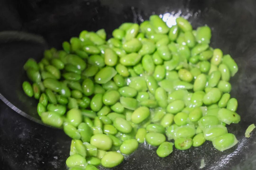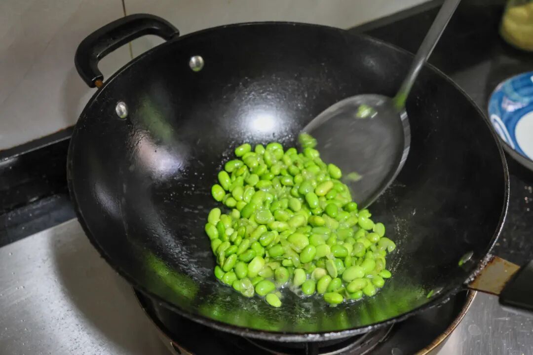 起锅烧油,锅中倒入洗好的毛豆进行翻炒,让每颗毛豆裹上油香,小火煸炒。