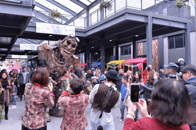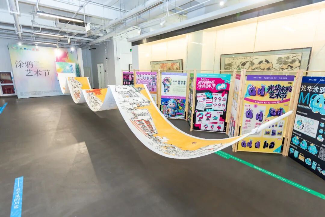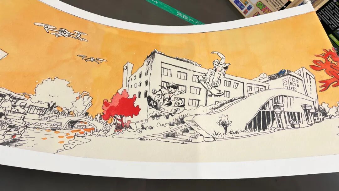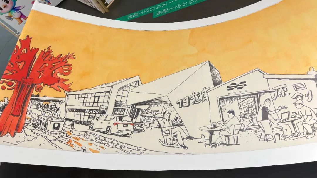 长卷的中段,画面转向现代:上班族们拿着电脑端着咖啡、居民在街区的涂鸦墙前驻足欣赏、孩子们在创意市集流连忘返……居民们悠闲的生活取代了昔日的机器轰鸣。在艺术家的笔下,光华路已从昔日的工业土壤中蜕变出文化与生活共融的新貌。
