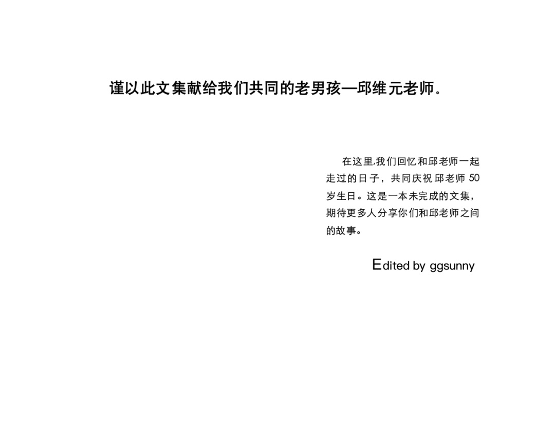 厚厚书页前的扉页上,写着这样一行字:“谨以此文集献给我们共同的老男孩——邱维元老师”。