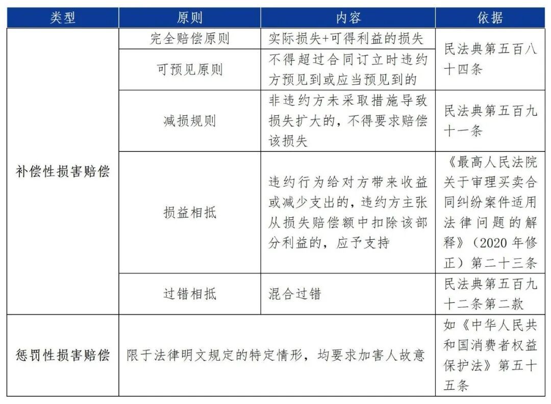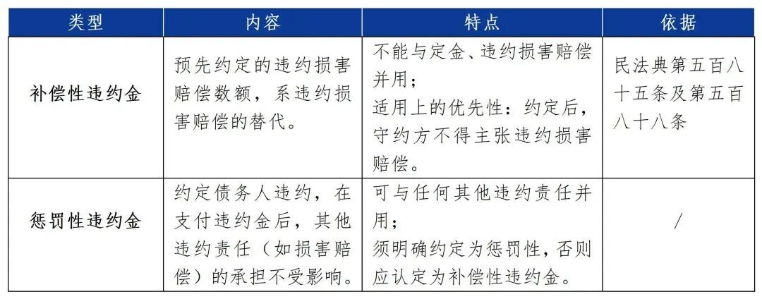 由此可知,惩罚性违约金需明确约定,否则为补偿性违约金,而补偿性违约金本质上属于损失赔偿额之预定,其主要功能在于填补守约方的损失,相当于履行之替代。违约损害赔偿是指违约方因不履行或者不完全履行合同义务给对方造成损失,根据法律规定或者合同约定应承担的损害赔偿责任。故,违约损害赔偿与补偿性违约金不能并用,可与惩罚性违约金并用。