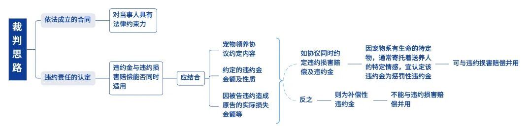 上述协议在约定违约损害赔偿的同时另行约定了违约金,即协议约定的违约责任包括违约损害赔偿和违约金。因宠物系有生命的特定物,通常寄托着送养人的特定情感,此时约定的违约金更具有惩罚性的特征,意在对违约方的违约行为进行惩罚,应认定为惩罚性违约金。因惩罚性违约金的金额不以守约方的实际损失为基础,且惩罚性违约金可与违约损害赔偿并用,故本案人民法院同时支持了违约金和已实际发生的寻宠费,既符合双方签订合同时的本意,也彰显了对违约方的惩罚,有助于提升领养人的契约意识,督促领养人按约履行领养义务,从而促进宠物领养行业有序发展。