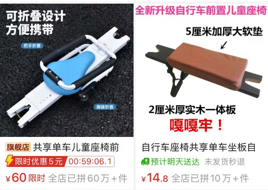 这种所谓的“儿童座椅”,其实就是在共享单车的前杠上,加装一块单独的座位。